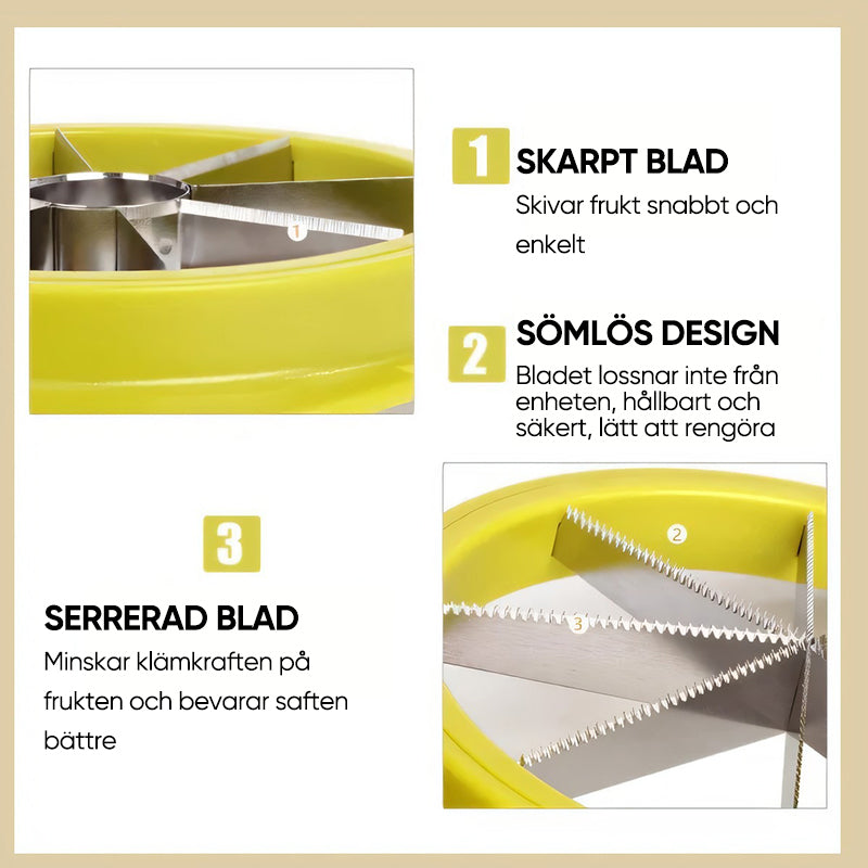 • Vår 4-i-1 fruktskivare innehåller en äppelkärnare, mangoskiva, tomatskiva och en robust säkerhetsbas. Lämplig för en mängd olika grönsaker och frukter, t.ex. äpplen, päron, mango, apelsiner, kiwi, tomater, lök, potatis m.m.
