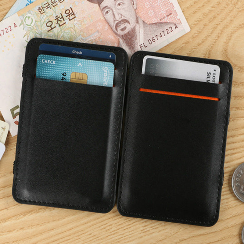 Släpp de traditionellt skrymmande plånböckerna med den här magiska tunna plånboken med vändkort! Denna innovativa plånbok är gjord med en unik flik som på magiskt sätt för in dina pengar bakom remmarna. Lägg bara pengarna ovanpå det elastiska bandet, stäng och vänd på det och öppna det igen för att se dina pengar imponerande stoppade in.